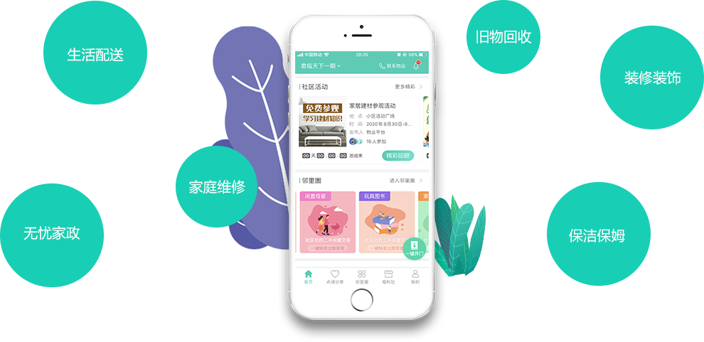 生活配送、家庭维修、无忧家政、旧物回收、装修装饰等,业主打开手机APP即可享受各种便民