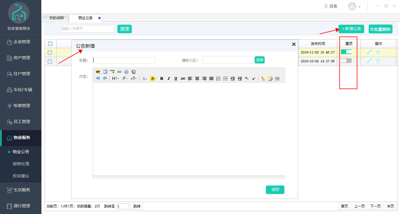 点击新增公告按钮,填写标题内容,选择需要发布此条公告的小区;选择是否置顶,是,则在业主APP上置顶显示该条信息。
